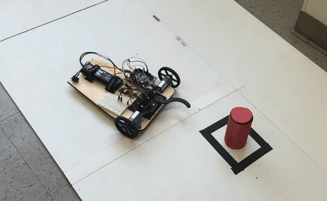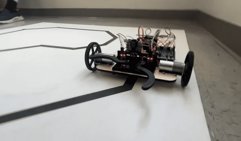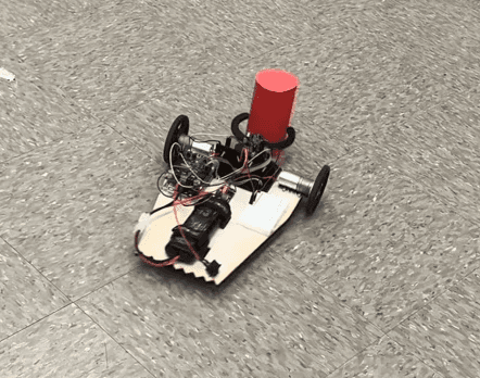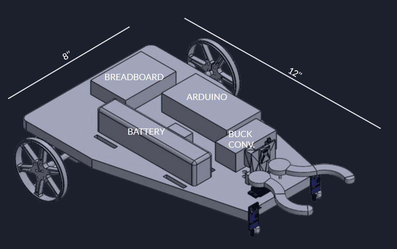 The objective of this project was to design, build, and validate an autonomous rover capable of navigating a defined course, identifying a target object using onboard sensing, and executing a precision capture maneuver without human input. The rover was required to follow a taped path using IR sensor feedback, transition to an object-search routine, recognize a colored target using a vision system, and then mechanically secure the object using a custom-designed claw mechanism. I designed and fabricated the rover chassis and claw mechanism, optimizing structural rigidity, component layout, and wiring accessibility. The team programmed the Arduino control system to enable full autonomy, developing a closed-loop line-following algorithm using IR sensor feedback and PWM motor control for accurate path tracking. We then integrated the PixyCam, configured color recognition, and implemented a state-machine logic system so the rover could transition between navigation, target detection, alignment, and grasping modes. After tuning thresholds and debugging sensor noise, the rover consistently followed the course, identified the colored object, and successfully captured it without human input.
